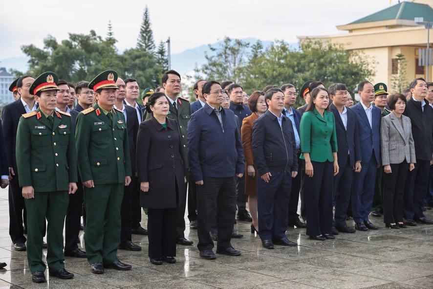 Thủ tướng Phạm Minh Chính và đoàn công tác dâng hoa tại Tượng đài "Bác Hồ với đồng bào các dân tộc tỉnh Lai Châu" - Ảnh: VGP/Nhật Bắc