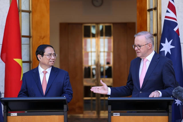 Thủ tướng Australia Anthony Albanese cho biết, hai bên quan tâm thúc đẩy hợp tác thương mại đầu tư để thúc đẩy thịnh vượng về kinh tế giữa hai nước. Kim ngạch thương mại giữa Việt Nam-Australia năm 2022 đã đạt 25,7 tỷ đô la Australia, tăng 75% so với năm 2020.