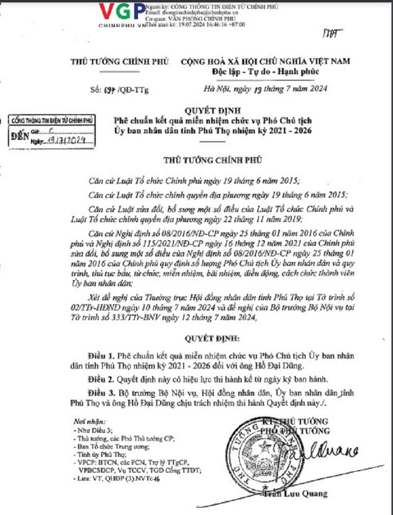 Quyết định miễn nhiệm chức vụ Phó Chủ tịch UBND tỉnh Phú Thọ đối với ông Hồ Đại Dũng (Ảnh: chinhphu.vn). |