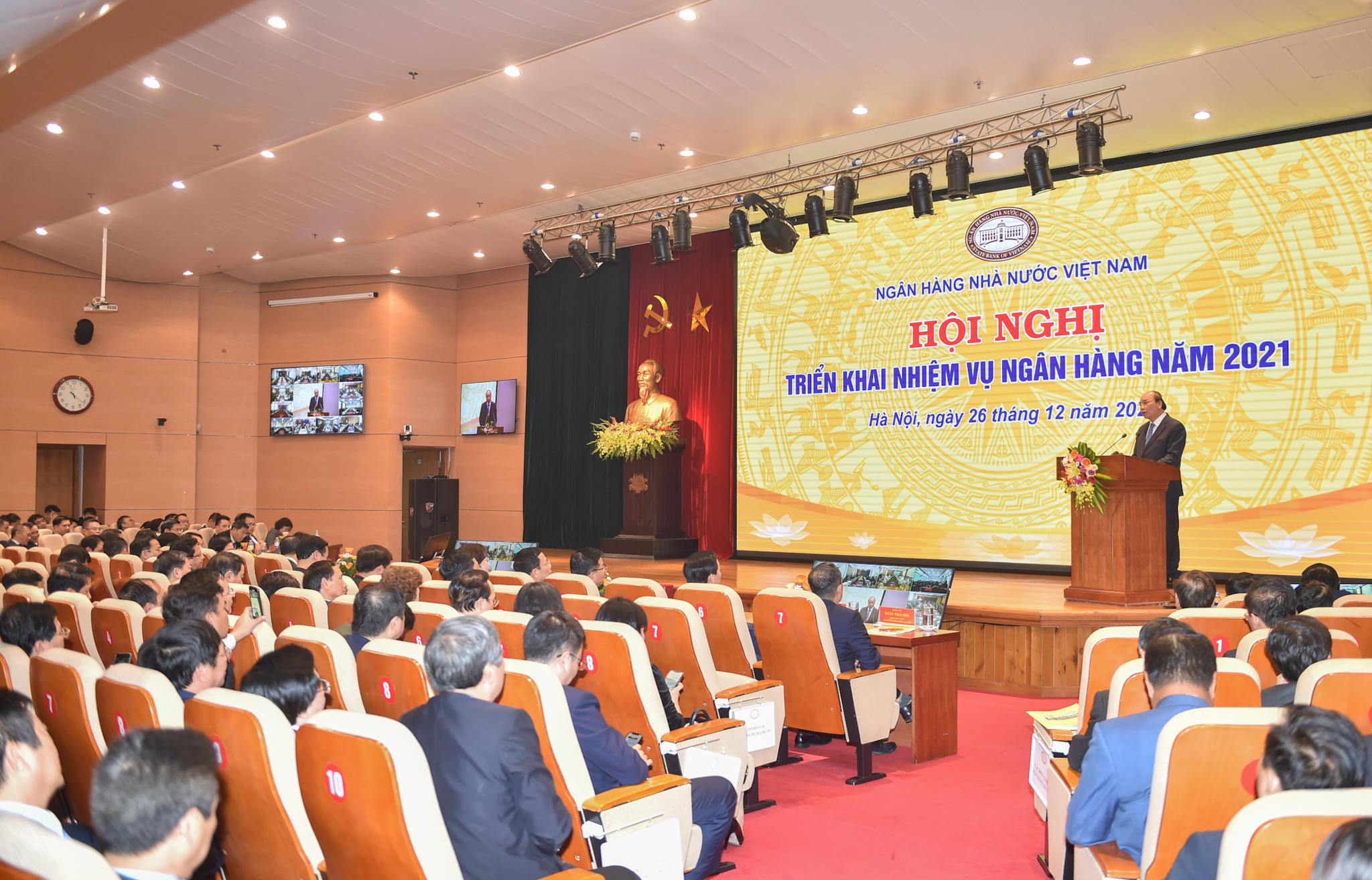 Phát biểu tại Hội nghị triển khai triển khai nhiệm vụ ngân hàng năm 2021 vào sáng nay, 26/12, Thủ tướng Nguyễn Xuân Phúc cho rằng, 5 năm qua, ngành Ngân hàng có bước phát triển vượt bậc, hoàn thành tốt các nhiệm vụ được giao. Năm 2020, chúng ta gặp rất nhiều thách thức, đặc biệt là dịch COVID-19. Ngành ngân hàng, với vai trò huyết mạch của nền kinh tế đã vào cuộc rất sớm với tinh thần "chống dịch như chống giặc"; chủ động có giải pháp ứng phó với tác động của dịch COVID-19, bão lũ, khắc phục khó khăn và hỗ trợ nền kinh tế. Điều hành chính sách tiền tệ chủ động, linh hoạt, khéo léo, góp phần duy trì ổn định vĩ mô, kiểm soát lạm phát và thúc đẩy tăng trưởng kinh tế. Tăng trưởng tín dụng đạt gần 11%.
