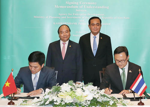 | Hai Thủ tướng chứng kiến lễ ký Biên bản ghi nhớ giữa Ngân hàng Kasikorn (Thái Lan) với Cục Phát triển doanh nghiệp (Bộ Kế hoạch và Đầu tư, Việt Nam). Ảnh: VGP/Quang Hiếu |