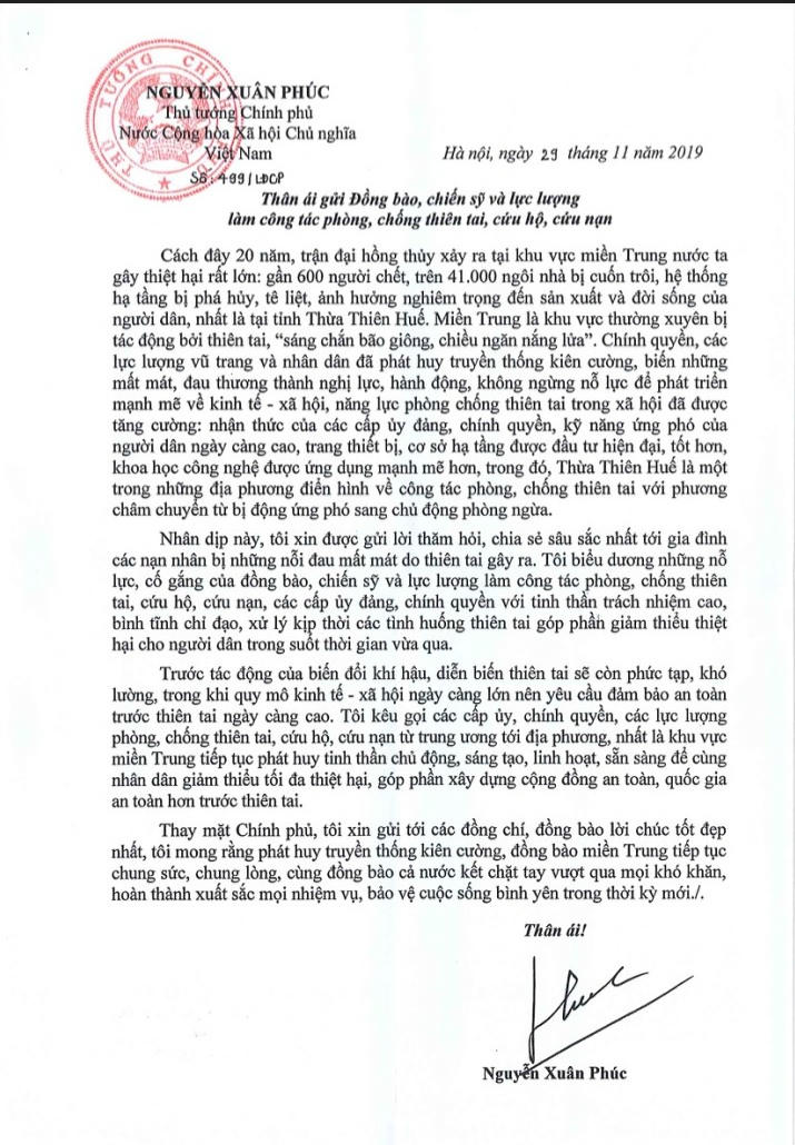 Thủ tướng Nguyễn Xuân Phúc gửi thư động viên, thăm hỏi đồng bào miền Trung nhân kỷ niệm 20 năm trận đại hồng thủy