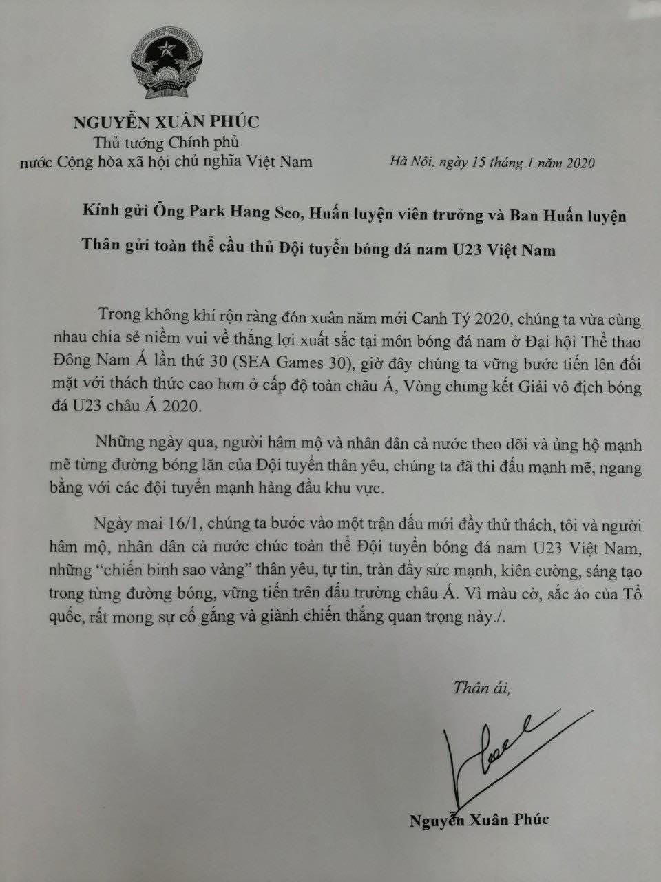 Thủ tướng Nguyễn Xuân Phúc viết: "Trong không khí rộn ràng đón xuân năm mới Canh Tý 2020, chúng ta vừa cùng nhau chia sẻ niềm vui về thắng lợi xuất sắc tại môn bóng đá nam ở Đại hội Thể thao Đông Nam Á lần thứ 30 (SEA Games 30), giờ đây chúng ta vững bước tiến lên đối mặt với thách thức cao hơn ở cấp độ toàn châu Á, Vòng chung kết Giải vô địch bóng đá U23 châu Á 2020.