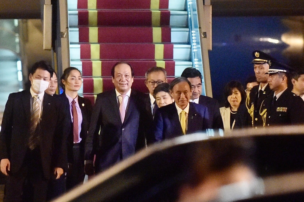 Đón Thủ tướng Nhật Bản Suga Yoshihide và Phu nhân Suga Mariko tại sân bay quốc tế Nội Bài có: Bộ trưởng, Chủ nhiệm Văn phòng Chính phủ Mai Tiến Dũng; Thứ trưởng Bộ Ngoại giao Lê Hoài Trung; Đại sứ Việt Nam tại Nhật Bản Vũ Hồng Nam; đại diện cơ quan Bộ Ngoại giao, Văn phòng Chính phủ... Về phía Nhật Bản có Đại sứ Nhật Bản tại Việt Nam Yamada Takio và cán bộ Đại sứ quán Nhật Bản tại Việt Nam.
