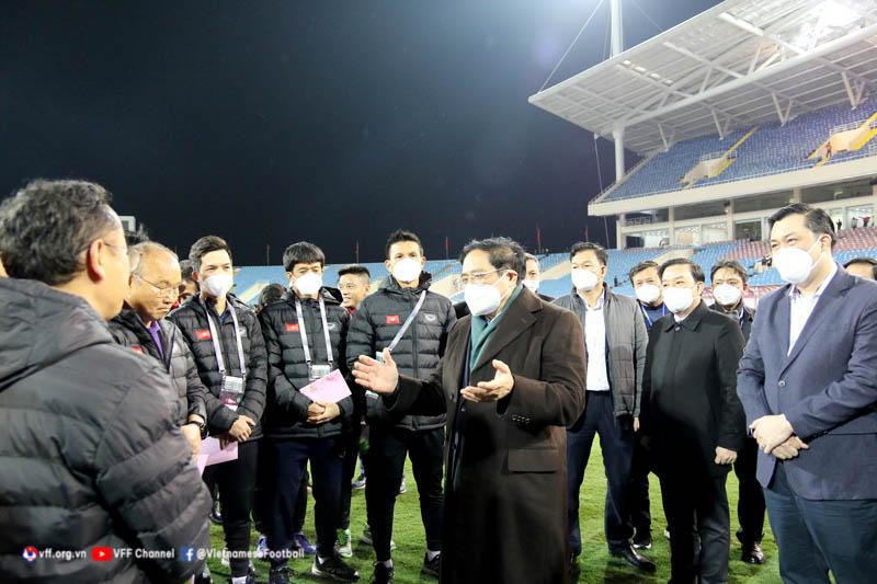 Thủ tướng Chính phủ Phạm Minh Chính biểu dương chiến thắng của ĐT Việt Nam trong ngày mùng 1 Tết cổ truyền. Ảnh: VFF