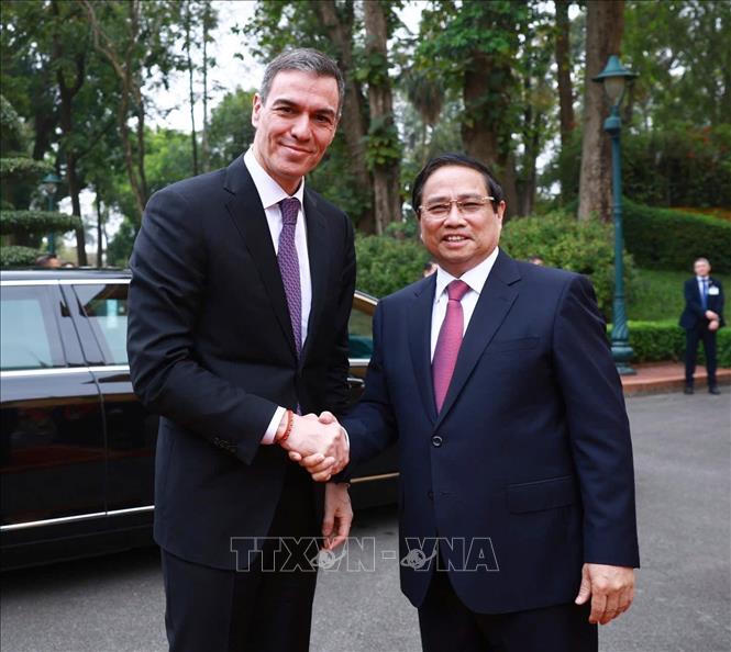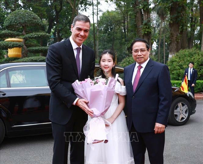 | Thủ tướng Phạm Minh Chính đón Thủ tướng Tây Ban Nha Pedro Sánchez. Ảnh: Dương Giang/ TTXVN |