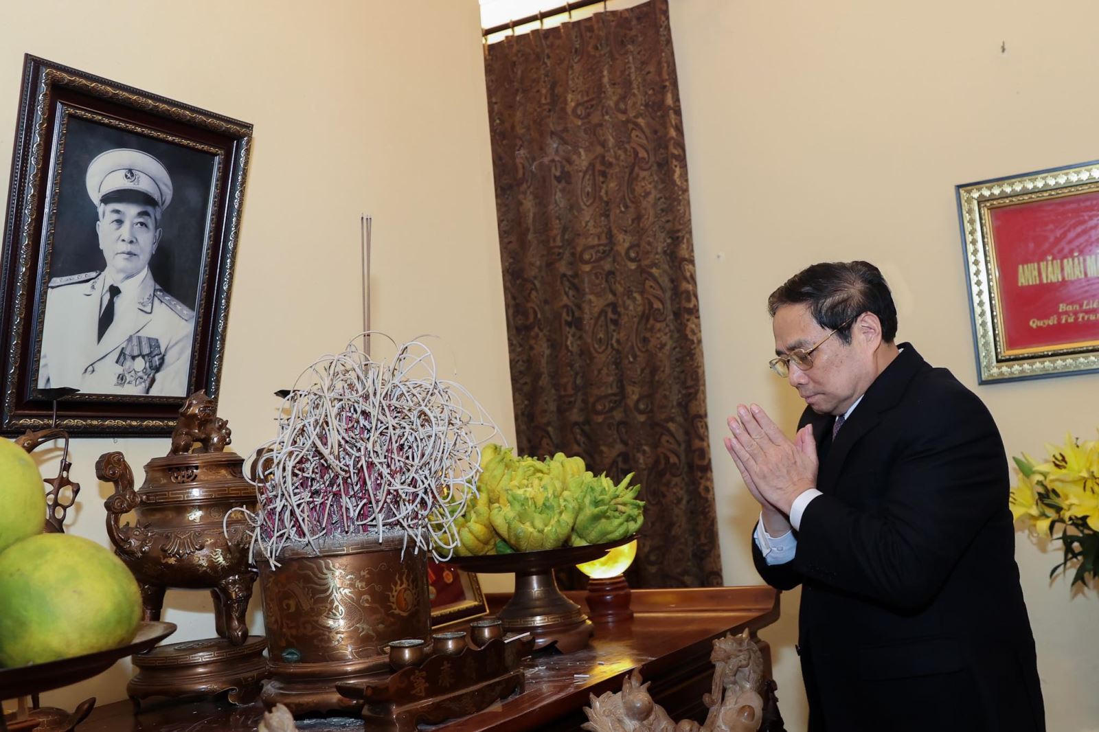 Tại nhà riêng Đại tướng Võ Nguyên Giáp, ở Thủ đô Hà Nội, Thủ tướng Phạm Minh Chính đã dâng hoa, dâng hương, bày tỏ lòng thành kính trước anh linh người học trò xuất sắc của Chủ tịch Hồ Chí Minh, vị tướng huyền thoại của dân tộc đã cống hiến trọn đời vì độc lập, tự do của Tổ quốc, vì hạnh phúc của nhân dân; ghi nhớ công lao Đại tướng đối với sự nghiệp cách mạng vẻ vang của Đảng và dân tộc Việt Nam.