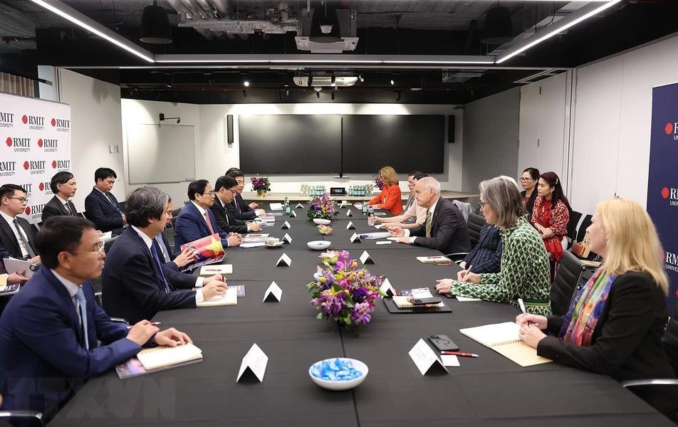Thủ tướng Phạm Minh Chính làm việc với lãnh đạo Trường Đại học RMIT và Viện Nghiên cứu châu Á. (Ảnh: Dương Giang/TTXVN)