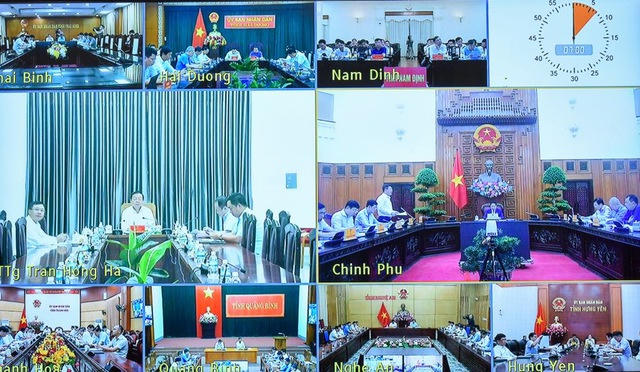 Hội nghị được tổ chức theo hình thức trực tuyến tại điểm cầu trụ sở Chính phủ với điểm cầu 9 tỉnh có dự án đi qua - Ảnh: VGP/Nhật Bắc