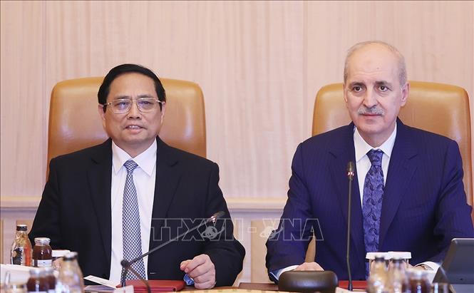 Thủ tướng Phạm Minh Chính và Chủ tịch Quốc hội Thổ Nhĩ Kỳ Numan Kurtulmus. Ảnh: Dương Giang/TTXVN