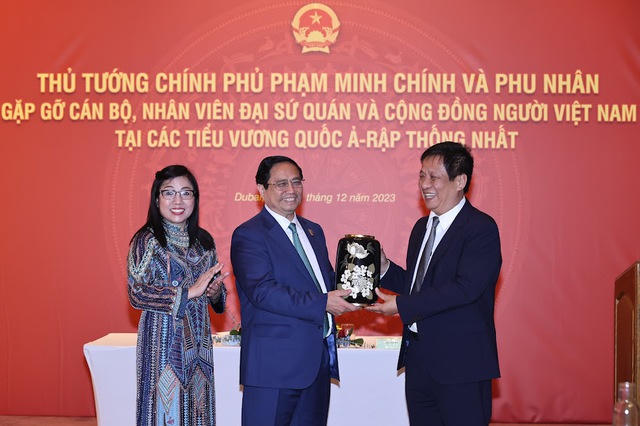 (PLVN) - Trong chương trình hoạt động song phương tại Các Tiểu vương quốc Arab thống nhất (UAE), tối 01/12 (giờ địa phương), tại Dubai, Thủ tướng Chính phủ Phạm Minh Chính và Phu nhân Lê Thị Bích Trân cùng đoàn đại biểu Việt Nam đã gặp gỡ cán bộ, nhân viên Đại sứ quán và cộng đồng người Việt Nam tại UAE.
