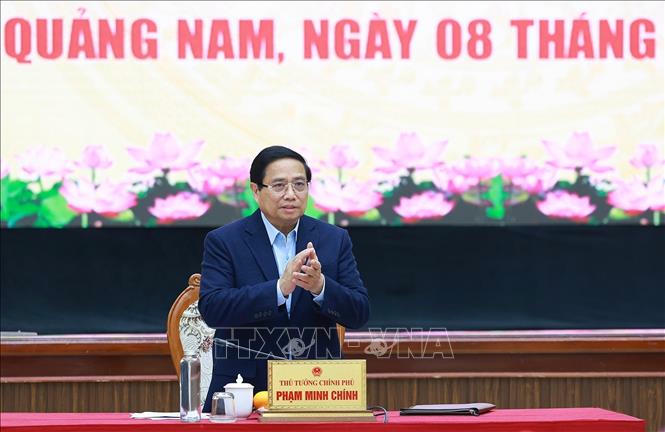 Thủ tướng Phạm Minh Chính với lãnh đạo tỉnh Quảng Nam. Ảnh: Dương Giang/TTXVN