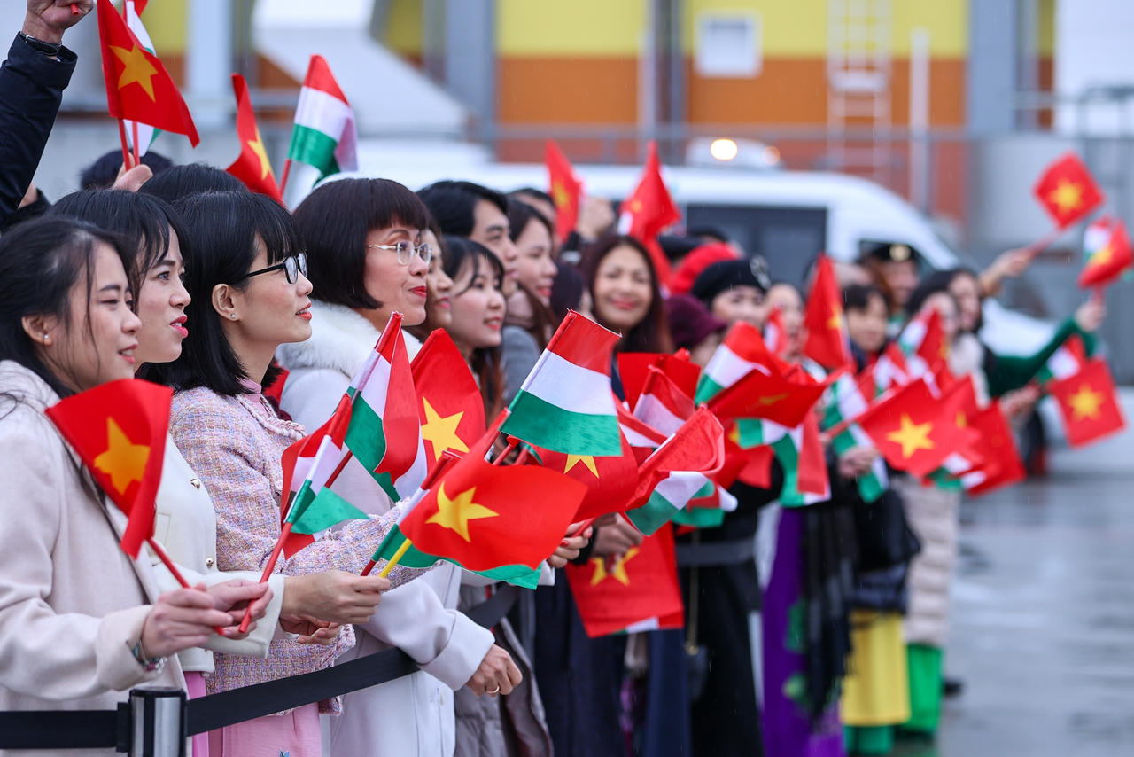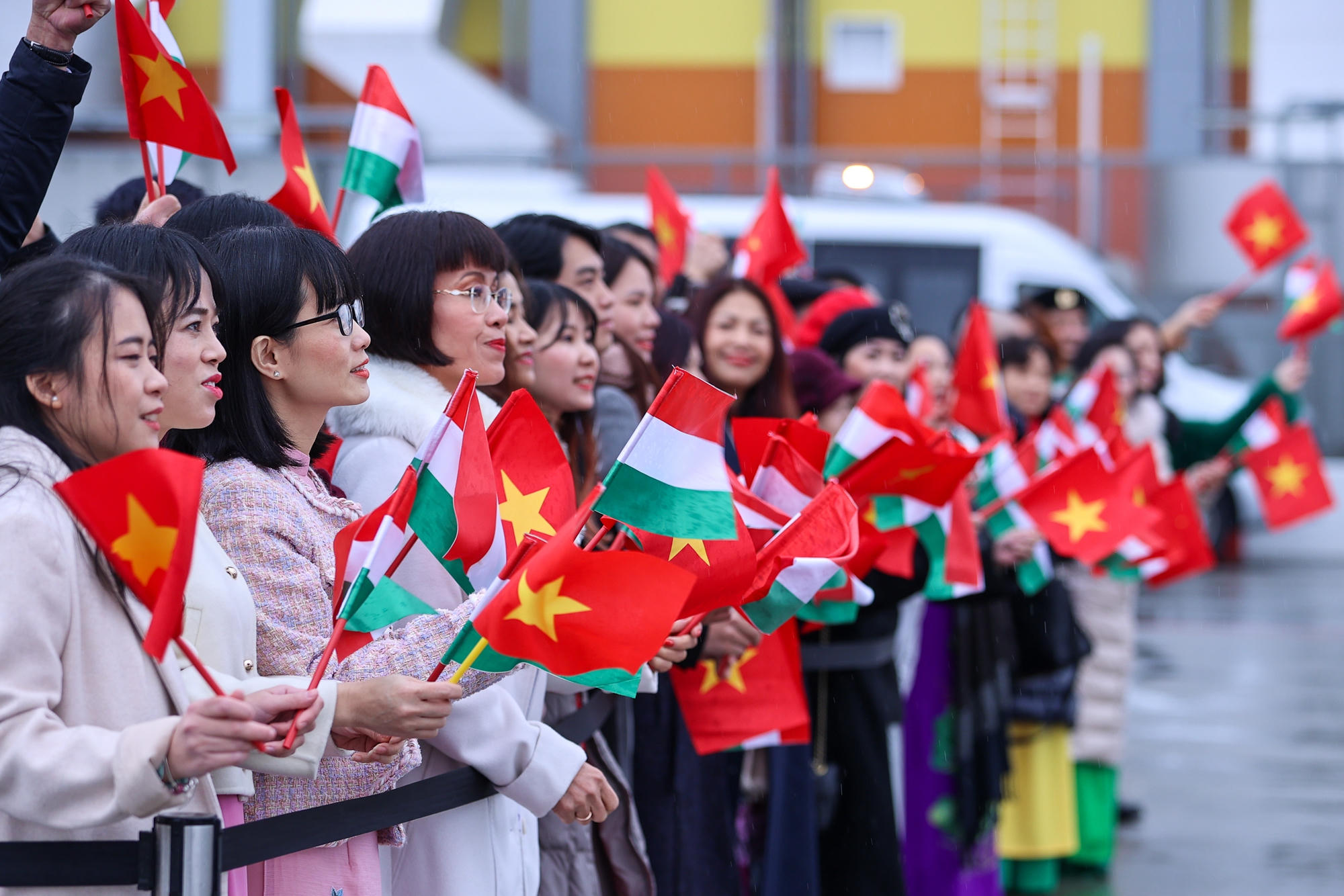 Cán bộ, nhân viên Đại sứ quán và đại diện kiều bào Việt Nam tại Hungary ra sân bay đón Thủ tướng Phạm Minh Chính và Phu nhân, cùng Đoàn đại biểu cấp cao Việt Nam - Ảnh: VGP/Nhật Bắc