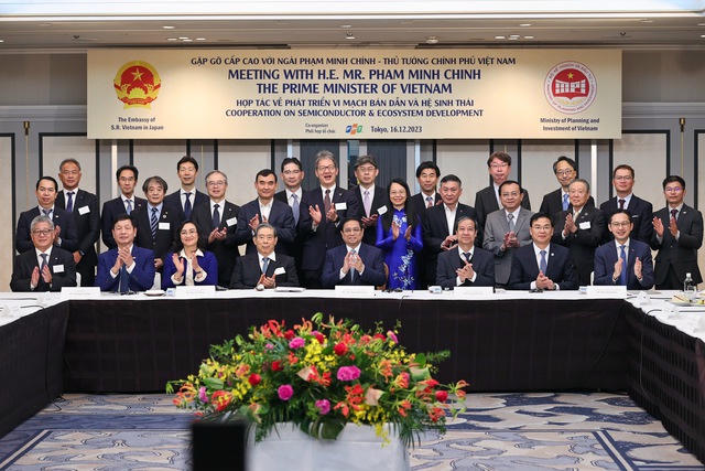 (PLVN) - Sáng 16/12, tại Tokyo, tiếp tục chương trình hoạt động song phương tại Nhật Bản, Thủ tướng Phạm Minh Chính có cuộc gặp gỡ, làm việc với các tập đoàn, doanh nghiệp hàng đầu của Nhật Bản về hợp tác phát triển vi mạch bán dẫn và hệ sinh thái đi cùng, với mong muốn phát triển đột phá ngành bán dẫn của Việt Nam.