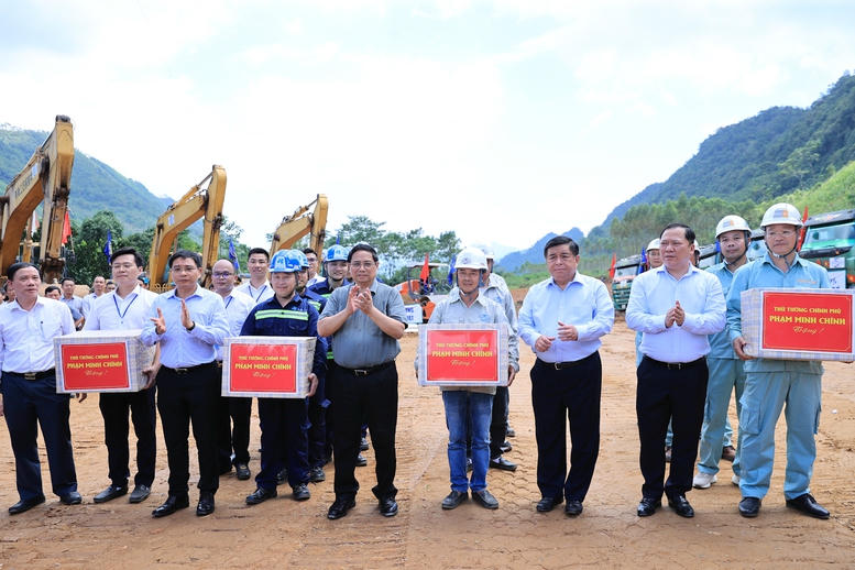 Thủ tướng Phạm Minh Chính tặng quà các đơn vị thi công - Ảnh: VGP/Nhật Bắc |