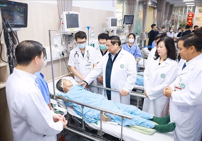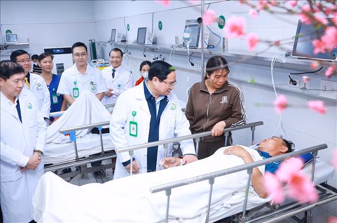Nói chuyện với y, bác sĩ, Thủ tướng thăm hỏi tình hình cấp cứu các ca bệnh dịp Tết; động viên các y bác sĩ nỗ lực tranh thủ giờ vàng, “xử trí trước - thủ tục sau”, tuyệt đối không gây phiền hà cho người bệnh.