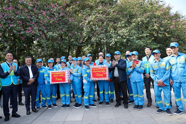 Thủ tướng đã đi thăm, tặng quà, chúc Tết, động viên các tổ công nhân vệ sinh môi trường của Công ty Môi trường đô thị Hà Nội (URENCO) đang làm nhiệm vụ tại khu vực đường Điện Biên Phủ và đường Hoàng Diệu.