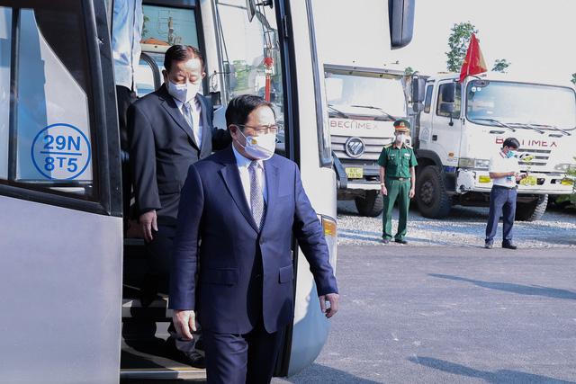 Thủ tướng Phạm Minh Chính và các đại biểu đến dự lễ khởi công dự án KCN Việt Nam-Singapore III bằng xe buýt - Ảnh: VGP/Nhật Bắc