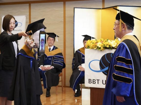 Sinh viên tham gia lễ tốt nghiệp qua ứng dụng được phát triển bởi tập đoàn ANA Holding. Ứng dụng này cho phép người nhận bằng điều khiển một con robot với ảnh của chính họ hiển thị trên màn hình.