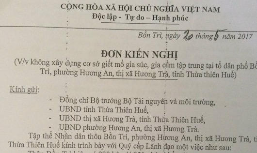 | Đơn kiến nghị của người dân thôn Bồn Trì gửi Bộ Tài nguyên và Môi trường và UBND tỉnh Thừa Thiên Huế |