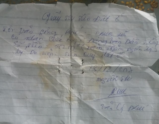 Anh Đặng Như Thọ (39 tuổi) bức xúc cho biết: “Tám hộ dân chúng tôi đều nghèo, bám nghề mua bán xe chai, làm ruộng. Bản thân tôi gia đình đông anh em, sau khi lấy vợ không có nhà, không có đất nên phải đi ở đậu nhiều nơi. Đến năm 2003, tôi là một trong bốn người được xã cấp đất đầu tiên nhưng đến nay vẫn chưa được cấp sổ đỏ. Chúng tôi đã có đơn, rồi đi khiếu kiện từ cấp huyện đển cấp tỉnh. Năm 2016, chúng tôi lên UBND huyện trình bày, Chủ tịch huyện biết sự việc cho lập đoàn thanh tra. Hơn chục năm cán bộ xã nơi đây đều hứa với dân “sẽ có sổ đỏ” nhưng ngóng mãi không thấy đâu”.