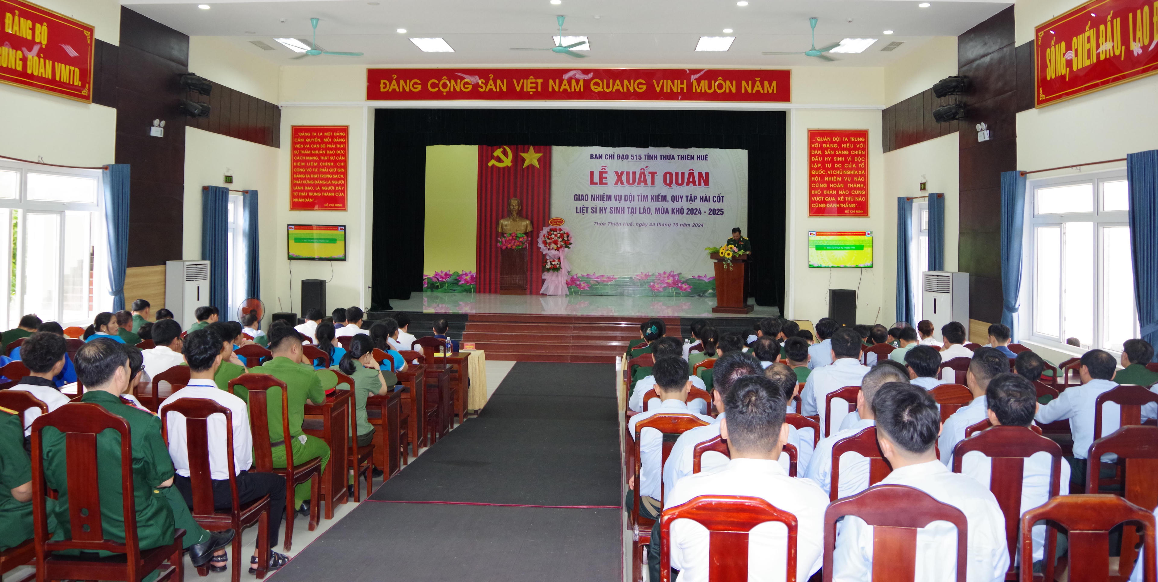 (PLVN) - Ngày 23/10, Ban Chỉ đạo 515 tỉnh Thừa Thiên Huế tổ chức lễ xuất quân cho Đội Quy tập 192 - Bộ Chỉ huy Quân sự (CHQS) tỉnh Thừa Thiên Huế lên đường đi làm nhiệm vụ tìm kiếm, quy tập hài cốt liệt sĩ (HCLS) trên đất bạn Lào, mùa khô 2024 - 2025.