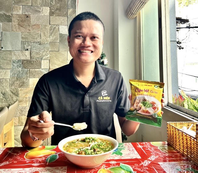 Ông chủ Cà Mèn Nguyễn Đức Nhật Thuận và sản phẩm cháo bột cá lóc đóng gói. |