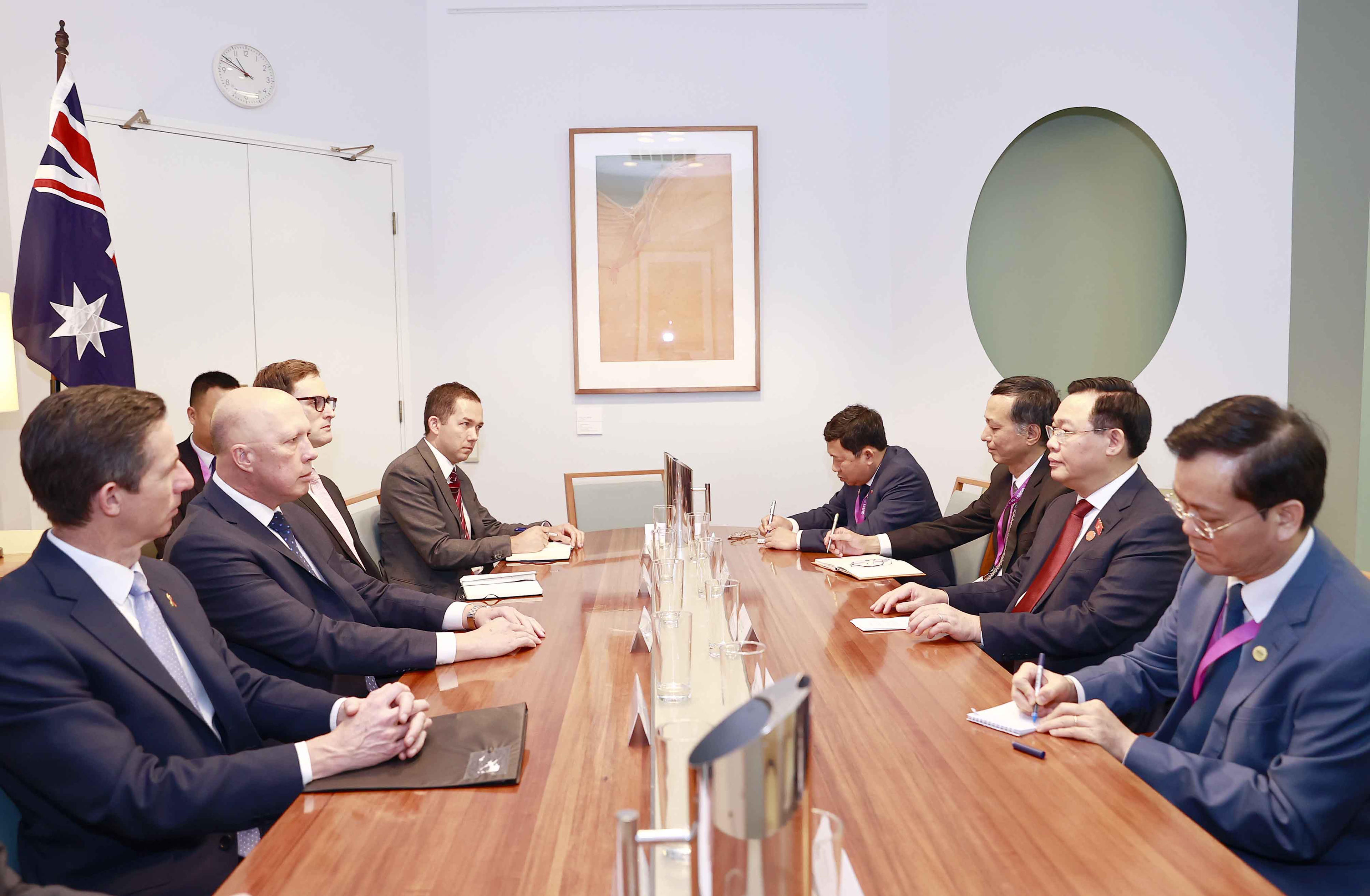 Chủ tịch QH mong muốn, trong vai trò của mình, Lãnh tụ đảng Đối lập tại Hạ viện Peter Dutton và Thượng nghị sĩ Simon Birmingham tiếp tục đóng góp tích cực cho quan hệ Đối tác Chiến lược Việt Nam-Australia. Hạ nghị sĩ Peter Dutton và Thượng nghị sĩ Simon Birmingham nhất trí phối hợp với các cơ quan đối tác của Việt Nam để tiếp tục thúc đẩy hợp tác trong các lĩnh vực cụ thể, trong đó có trao đổi đoàn, tăng cường hợp tác dưới nhiều hình thức giữa Đảng Cộng sản Việt Nam với các chính đảng Australia, triển khai các cơ chế hợp tác, phối hợp thúc đẩy triển khai các văn kiện đã ký kết giữa hai nước, nghiên cứu mở rộng hợp tác trong các lĩnh vực biến đổi khí hậu, tăng trưởng xanh, chuyển đổi năng lượng, chuyển đổi số, kinh tế số....