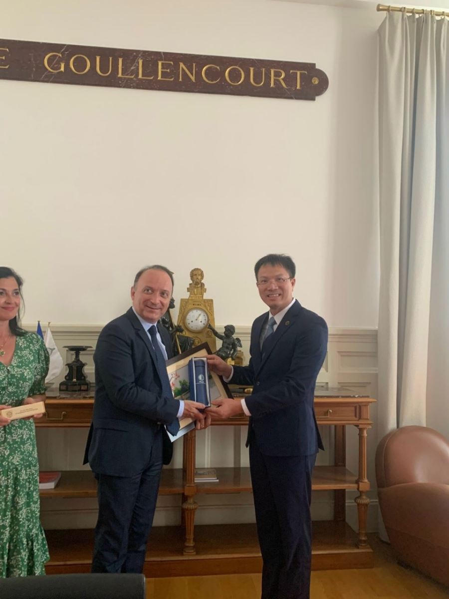 Hiệu trưởng Đoàn Trung Kiên tặng quà lưu niệm cho GS Stéphane Braconnier Chủ tịch Đại học Paris II- Panthéon Assas. |