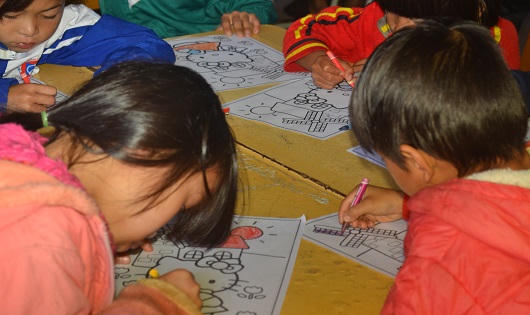 Em Hồ Văn Ra-dơ hào hứng: “Em rất vui khi được cùng các bạn chơi trò chơi, trò chuyện cùng các anh chị Tình nguyện viên. Chúng em còn được đem tranh về khi đã tô màu xong.”
