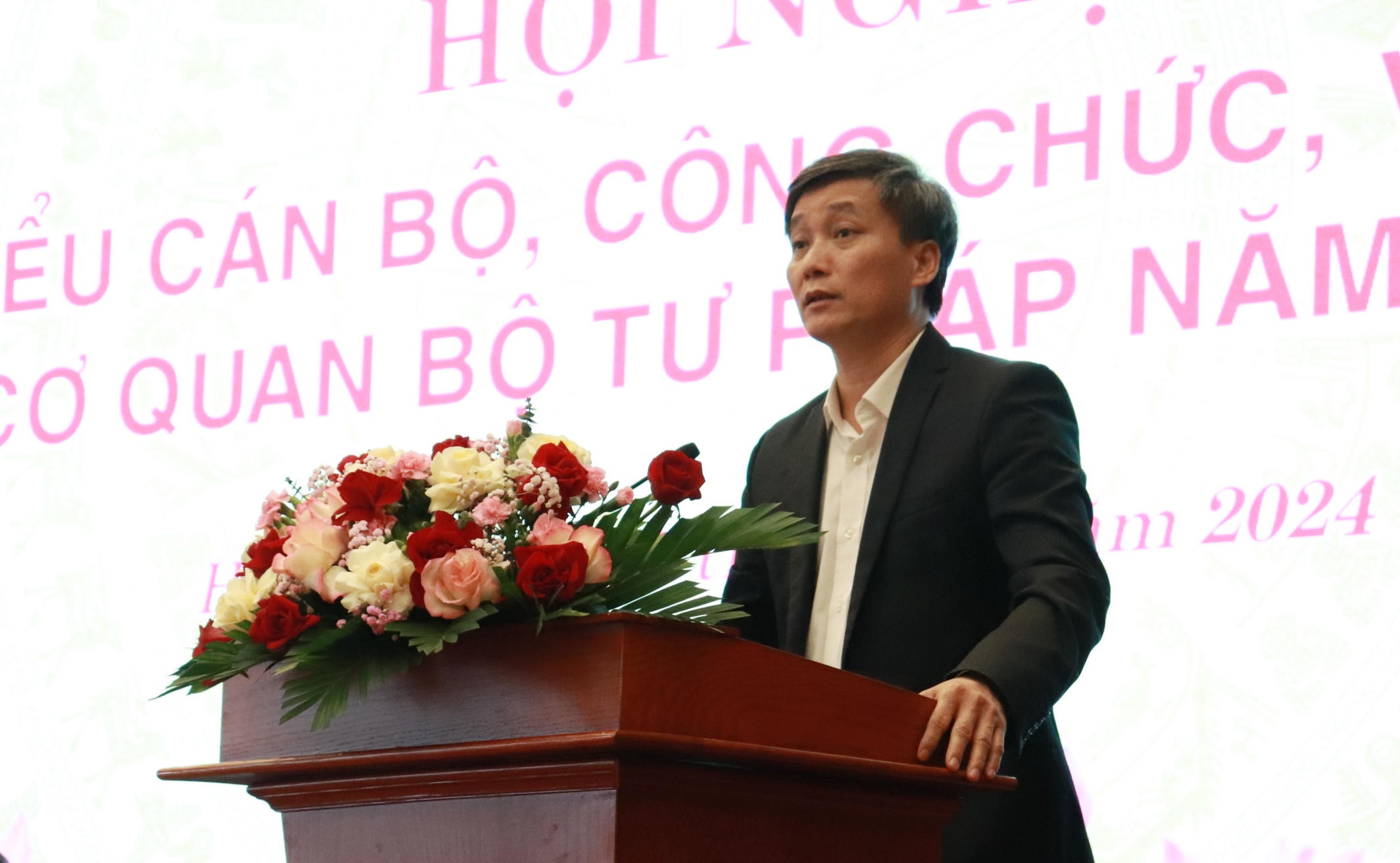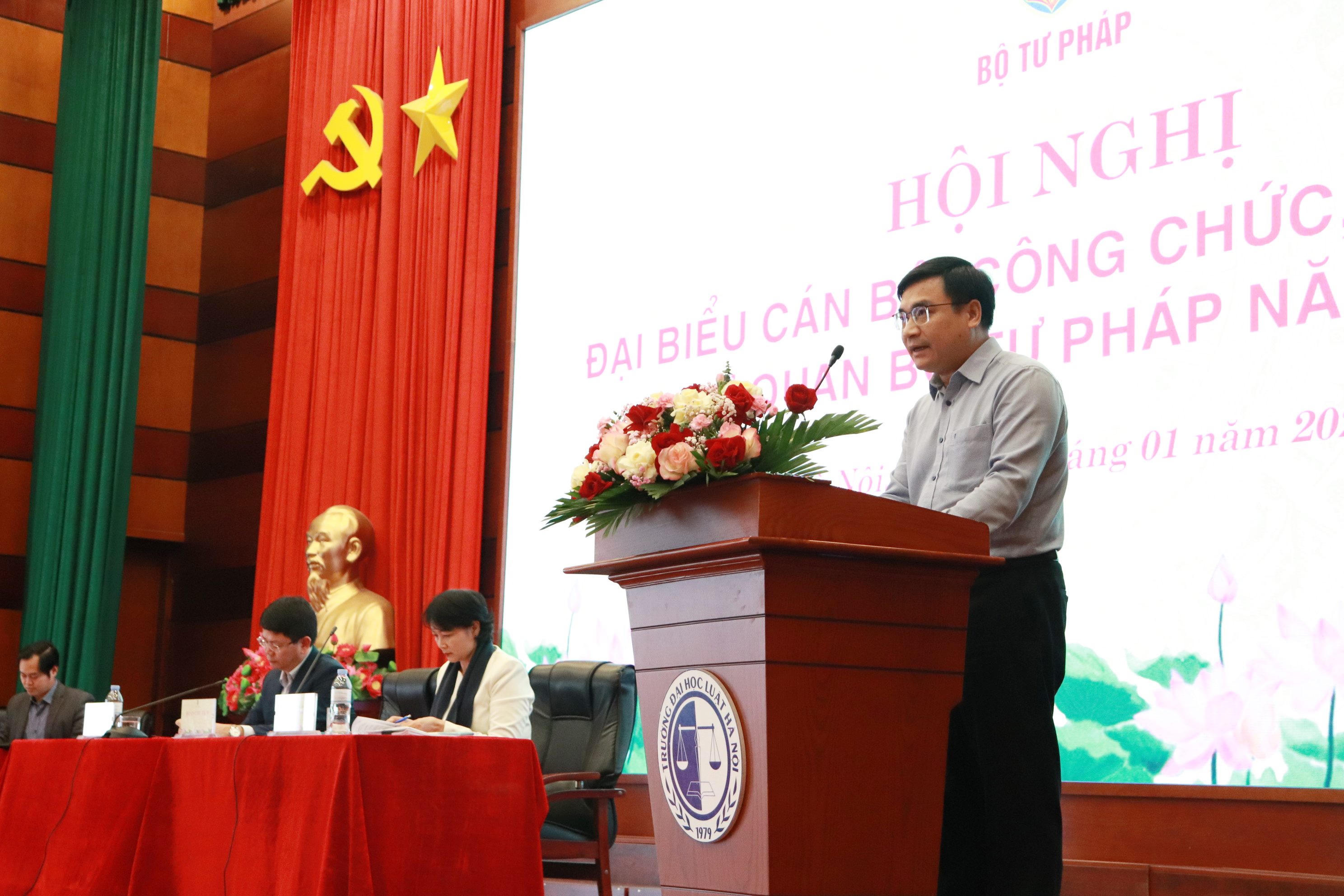 Phó Chánh Văn phòng Bộ Tư pháp Lê Tuấn Phong trình bày báo cáo tóm tắt kết quả thực hiện Nghị quyết Hội nghị cán bộ, công chức, viên chức năm 2022. |