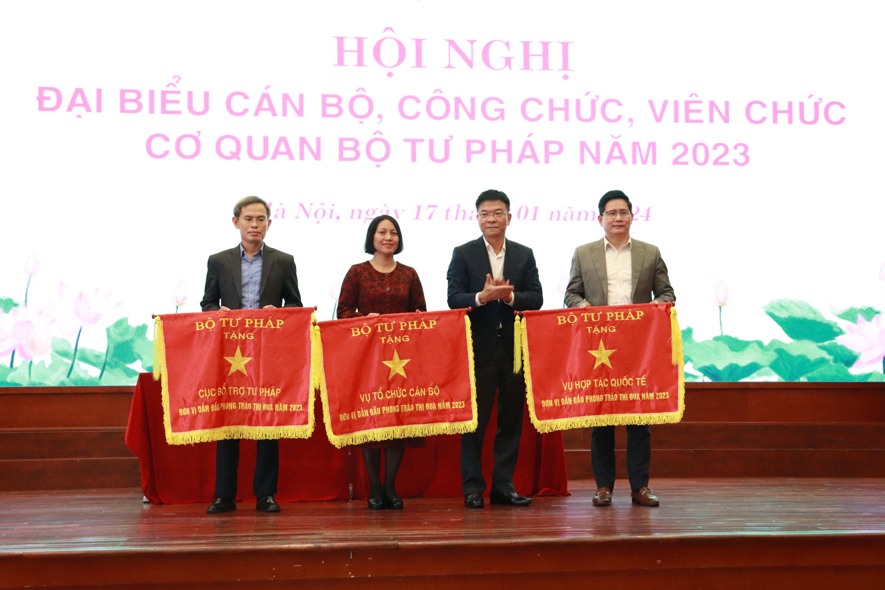 Bộ trưởng Lê Thành Long tặng Cờ thi đua ngành Tư pháp cho 3 tập thể. |