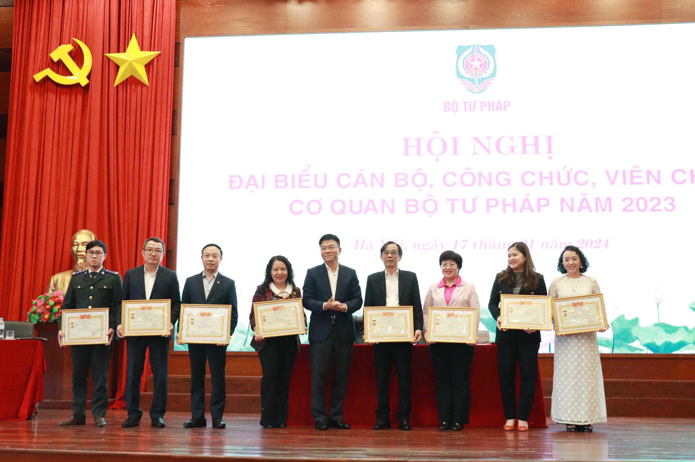 Bộ trưởng Lê Thành Long trao tặng danh hiệu Chiến sĩ thi đua ngành Tư pháp cho các cá nhân. |