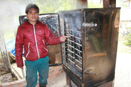 Tủ ủ cơm rượu và các thiết bị nấu rượu măng lá truyền thống được gia đình làm lâu nay, hiện vợ ông Liếc phụ trách.