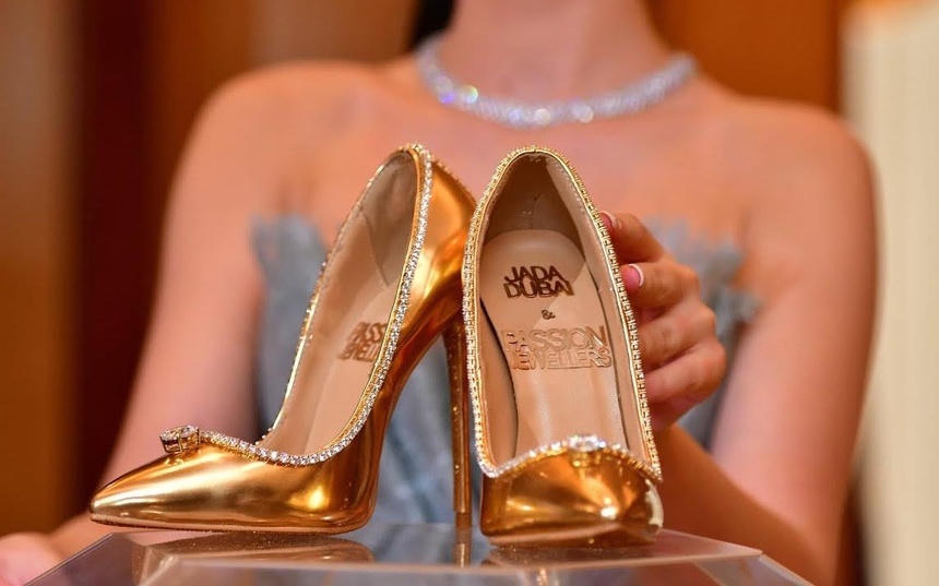 Đôi cao gót màu vàng lấp lánh, sản phẩm của thương hiệu Jada Dubai hợp tác với Passion Jewellers, có giá 17 triệu USD (khoảng 395 tỷ đồng). Jada Dubai được xem là thương hiệu chỉ tạo ra những đôi giày đắt giá.