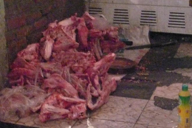 Ngày 1/10/2014, Đoàn Kiểm tra liên ngành phòng chống dịch gia súc, gia cầm huyện Bình Chánh, TP.HCM bất ngờ kiểm tra tại địa chỉ F7/1C ấp 6, xã Vĩnh Lộc B, huyện Bình Chánh phát hiện cơ sở sản xuất chà bông quy mô lớn nhưng không có giấy phép và điều kiện vệ sinh cơ sở không đảm bảo an toàn thực phẩm. Ảnh: Lao động.