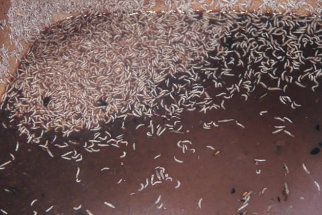 Khi khám xét, cơ quan chức năng còn phát hiện bên hông căn nhà có một thùng cỡ lớn loại 500 lít chứa nguyên liệu mắm tôm với hàng nghìn con dòi bò lúc nhúc. Theo chủ cơ sở này, mắm được mua từ các tỉnh phía Bắc và Hà Nội về, sau đó chế biến và sang chiết từ thùng lớn sang chai nhỏ rồi cung cấp ra thị trường. Tuy nhiên cơ sở mắm tôm này không có giấy phép kinh doanh và cũng không cung cấp giấy tờ chứng minh nguồn gốc số mắm trên, hoạt động hoàn toàn trái phép. Ảnh: Tuổi Trẻ.