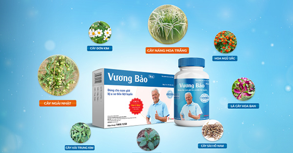 Thực phẩm bảo vệ sức khỏe Vương Bảo hỗ trợ giảm nguy cơ và hạn chế sự phát triển của u phì đại tiền liệt tuyến; Hỗ trợ cải thiện các rối loạn tiểu tiện ở nam giới có u xơ tiền liệt tuyến.