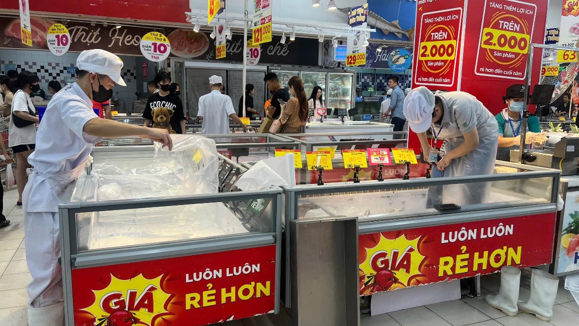 Nhân viên lau dọn tủ trưng bày vì thịt đã được bán hết. |