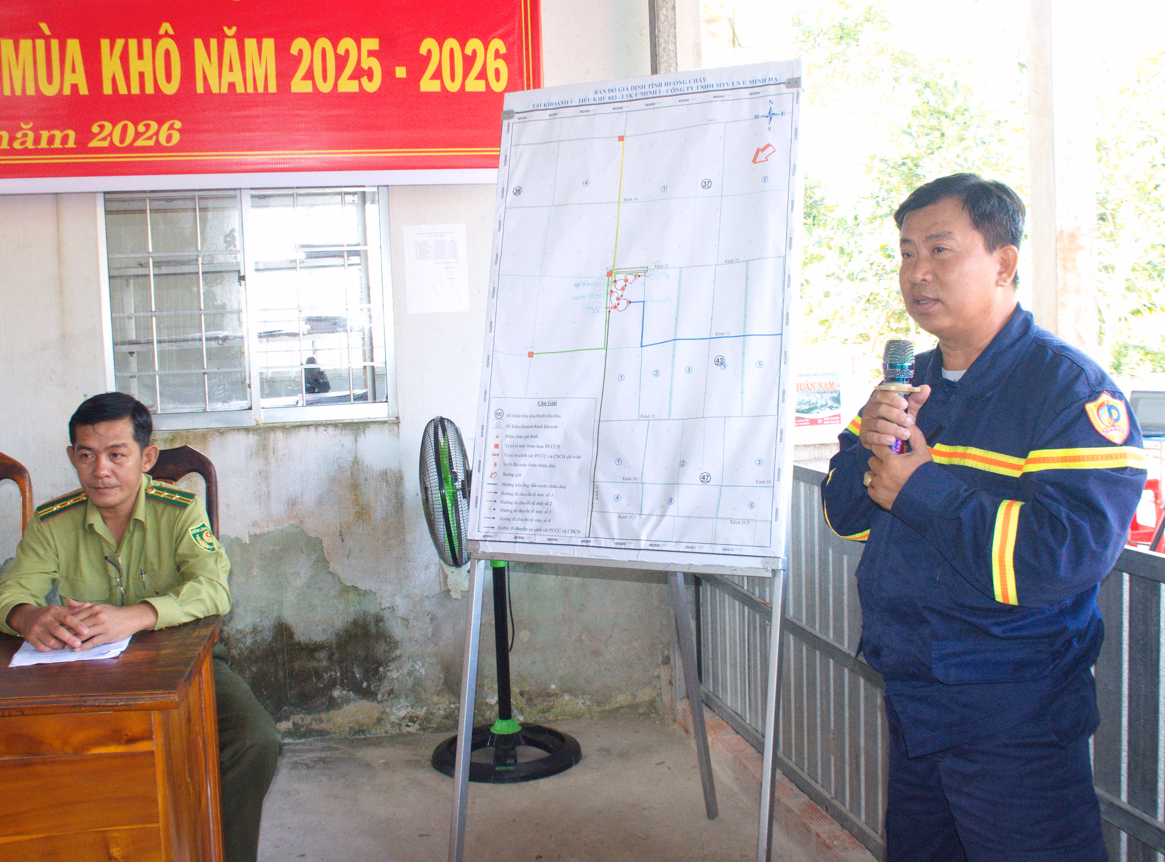 Theo ông Trần Ngọc Thảo, trong những tháng cao điểm mùa khô năm 2026, nguy cơ cháy rừng tại khu vực được dự báo ở cấp III (cấp cao), với nhiệt độ thường xuyên khoảng 35°C, thực bì khô hanh, độ ẩm thấp và gió mạnh. Những yếu tố này làm gia tăng nguy cơ phát sinh và lan rộng cháy rừng, đòi hỏi các đơn vị liên quan duy trì trạng thái sẵn sàng ứng phó ở mức cao.