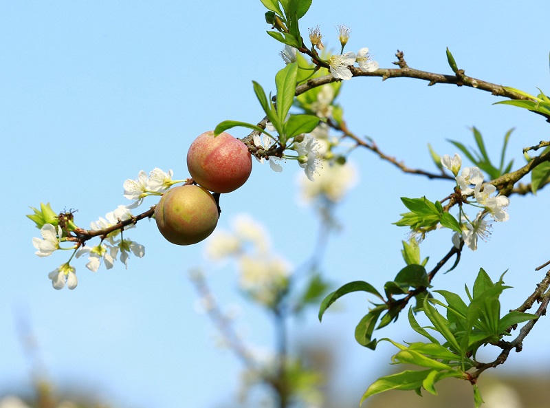 Những quả mận chín sớm đã bắt đầu chúm chím đỏ lấp ló trên cành.