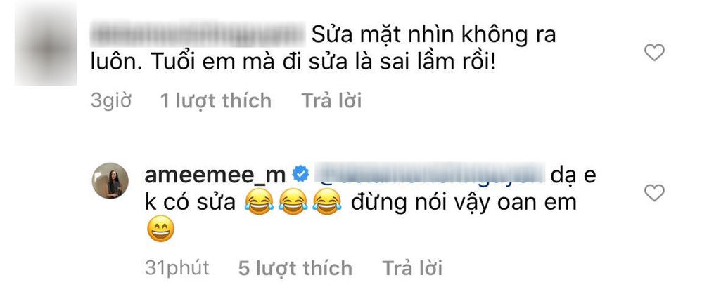 AMEE thẳng thắn cho biết mình không hề sửa. Cô còn nhắn chủ nhân của bình luận rằng "đừng nói vậy oan em", kèm theo icon cảm xúc dễ thương.