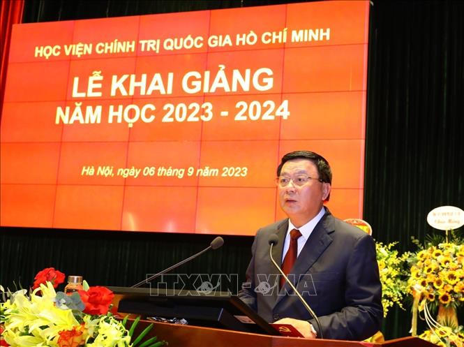 Sáng 6/9, tại Hà Nội, Học viện Chính trị quốc gia Hồ Chí Minh tổ chức khai giảng năm học 2023-2024 theo hình thức trực tiếp kết hợp trực tuyến, với các điểm cầu tại 5 học viện trực thuộc và trường chính trị ở các tỉnh, thành phố trong cả nước.