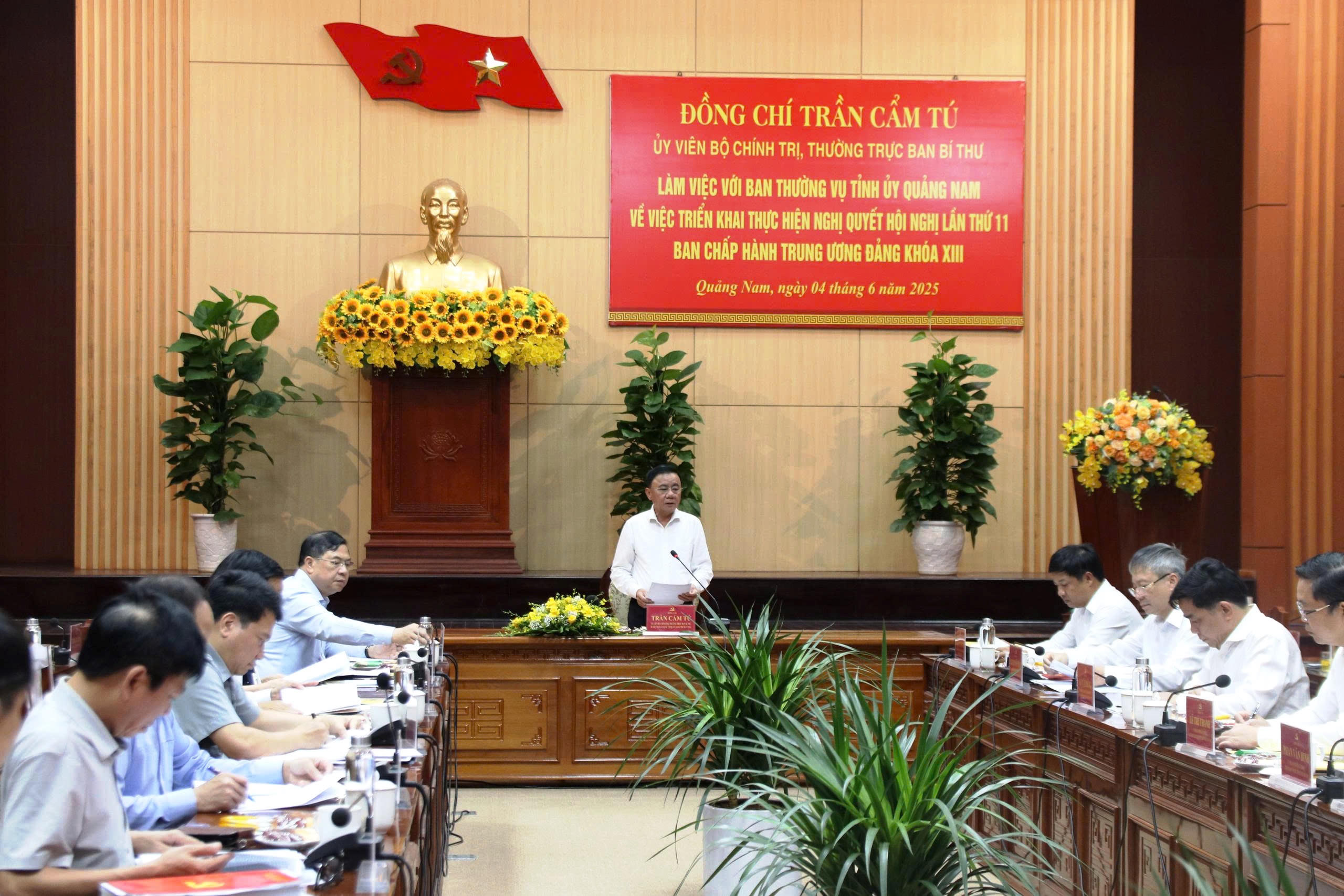 Thường trực Ban Bí thư nhấn mạnh, cấp ủy các cấp phải nghiêm túc quán triệt, thực hiện Nghị quyết Hội nghị Trung ương 11 và các kết luận của Bộ Chính trị, Ban Bí thư, đảm bảo tiến độ, đồng bộ trong sắp xếp tổ chức bộ máy từ tỉnh đến xã. Tỉnh Quảng Nam cần tập trung rà soát nhiệm vụ, xây dựng phương án, phân công rõ ràng, xác định thời gian hoàn thành cụ thể để kết thúc hoạt động cấp huyện cũ, vận hành cấp xã mới hiệu quả.Về công tác chuẩn bị Đại hội Đảng bộ các cấp, Thường trực Ban Bí thư Trần Cẩm Tú yêu cầu, cần đảm bảo chất lượng toàn diện về văn kiện, nhân sự, cập nhật đầy đủ các nội dung chỉ đạo mới của Trung ương, đặc biệt các Nghị quyết 57, 59, 66, 68; Lưu ý, trong phối hợp với Thành ủy Đà Nẵng, phải tuân thủ nguyên tắc Đảng, không để xảy ra cục bộ, lợi ích nhóm, tiêu cực. Tỉnh cần ưu tiên đào tạo cán bộ trẻ, nữ, dân tộc thiểu số và cán bộ khoa học công nghệ để xây dựng tập thể đoàn kết, thống nhất. Công tác đào tạo, bồi dưỡng cán bộ, công chức cấp xã phải được đẩy mạnh để đáp ứng ngay yêu cầu quản lý khi chính quyền mới đi vào hoạt động.