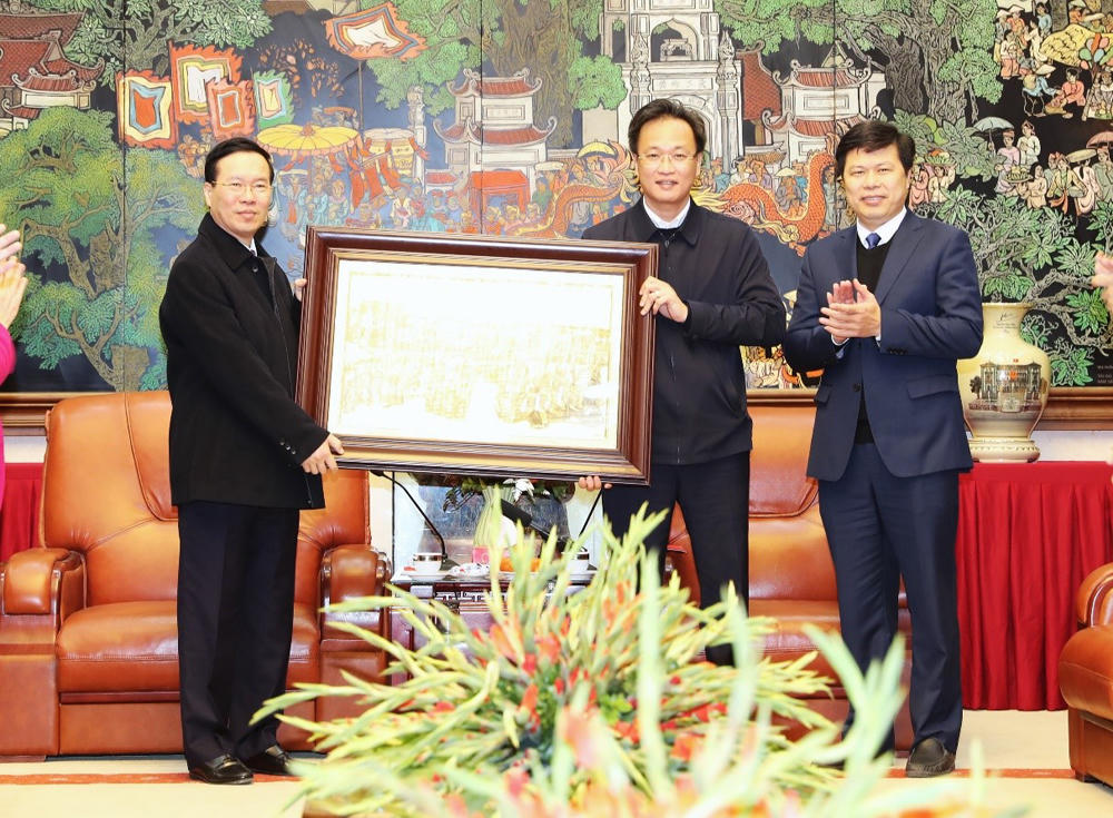 Bí thư Tỉnh ủy Hưng Yên Nguyễn Hữu Nghĩa trao bức tranh “Phố Hiến xưa” tặng Thường trực Ban Bí thư Võ Văn Thưởng (bên trái). |