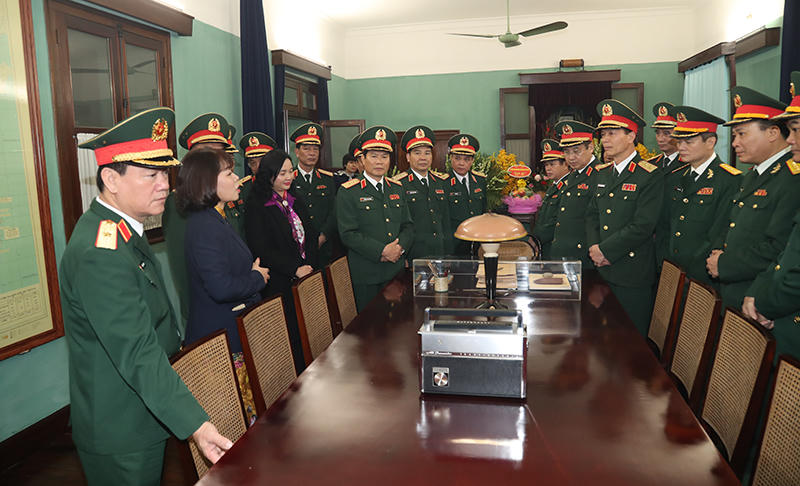 | Thượng tướng Nguyễn Tân Cương và các đại biểu thăm quan các hiện vật của Chủ tịch Hồ Chí Minh tại Nhà 67. |