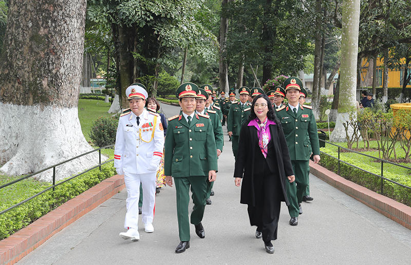 | Thượng tướng Nguyễn Tân Cương và các đại biểu dâng hương, đặt vòng hoa và vào Lăng viếng Chủ tịch Hồ Chí Minh. |