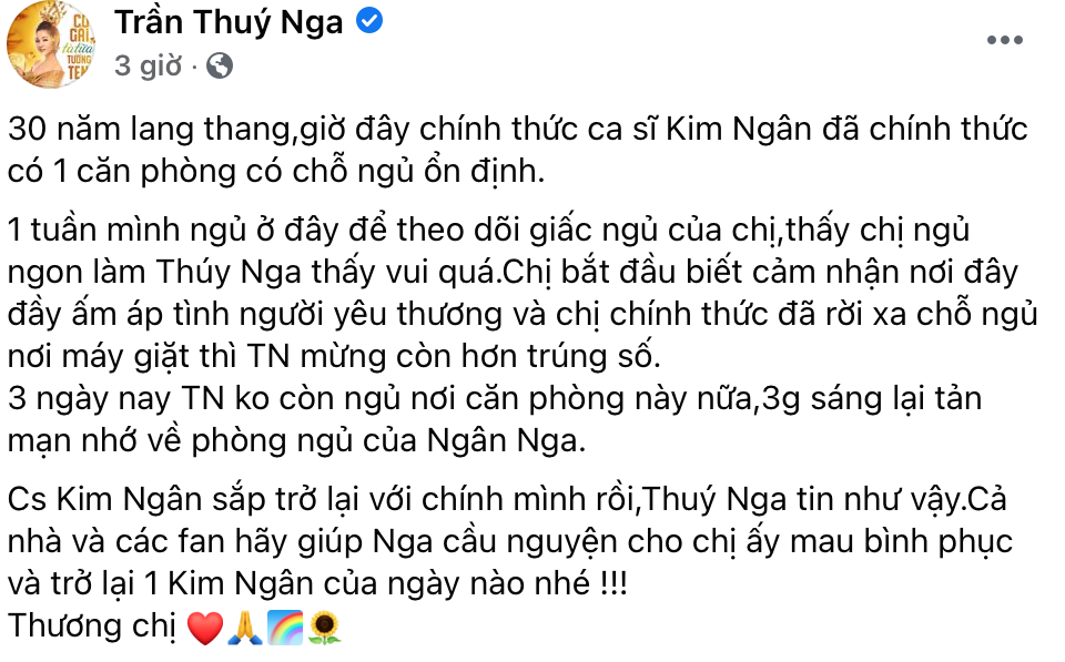 Sau 30 năm lang thang, cô Kim Ngân đã chính thức rời xa chỗ ngủ khu máy giặt để đến nơi tốt hơn. Điều đó làm một người "đàn em" như Thúy Nga vô cùng vui mừng vì cuối cùng cũng giúp được đàn chị. Thúy Nga tâm đắc chia sẻ: “Ca sĩ Kim Ngân sắp trở lại với chính mình rồi, Thúy Nga tin như vậy. Cả nhà hãy giúp Nga cầu nguyện cho chị ấy mau bình phục và trở lại là Kim Ngân của ngày nào nhé. Thương chị.”