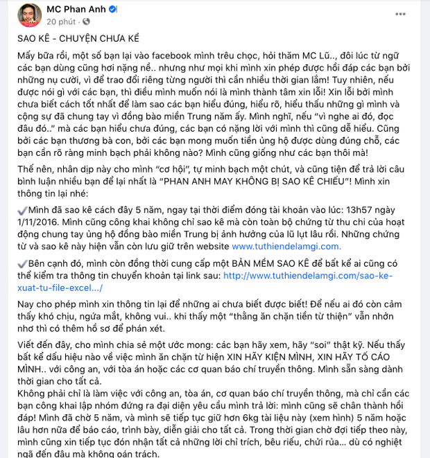 Giữa lúc từ khoá "sao kê" đang hot trên mạng xã hội, MC Phan Anh bất ngờ có bài viết dài trên trang cá nhân về vụ việc anh kêu gọi cứu trợ miền Trung hồi năm 2016. MC Phan Anh tung ảnh 6,5kg giấy sao kê 24 tỷ đồng kèm dòng trạng thái: "Các bạn hãy xem, hãy soi thật kỹ. Nếu thấy bất kể dấu hiệu nào về việc mình ăn chặn từ thiện xin hãy kiện mình, xin hãy tố cáo với công an, với tòa án hoặc các cơ quan báo chí truyền thông. Mình sẵn sàng dành thời gian cho tất cả".