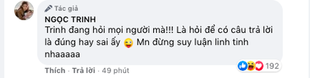 Giữa lúc dân tình đang tranh cãi, Ngọc Trinh đã lên tiếng giải thích rõ. Theo đó, cô cho biết chỉ đăng status để hỏi ý kiến của mọi người là quan điểm này đúng hay sai chứ không có mục đích nhắc đến ai cả. "Mọi người đừng suy luận linh tinh nha", Ngọc Trinh nhấn mạnh.